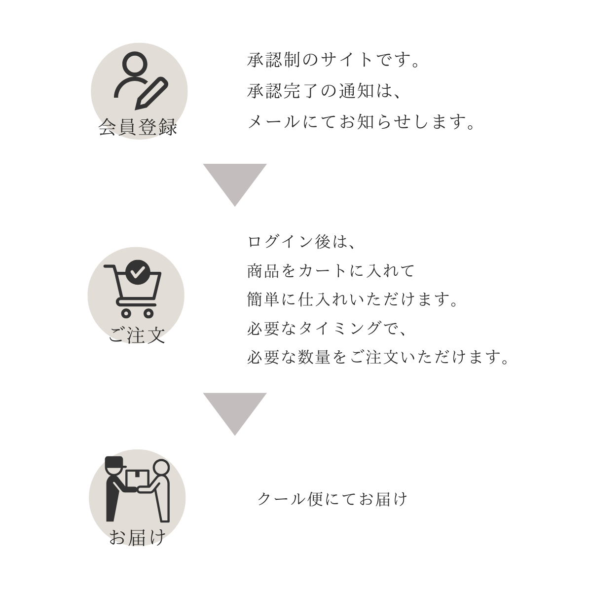 一般のお客様からは閲覧できない仕組みのため、店舗様専用の商品ページとしてご利用いただけます。その結果、仕入れ先が分かりにくく、オリジナル商品として自然に展開できる安心感があります。自信を持って店頭に並べていただけるのが、当サイトの大きなメリットです。